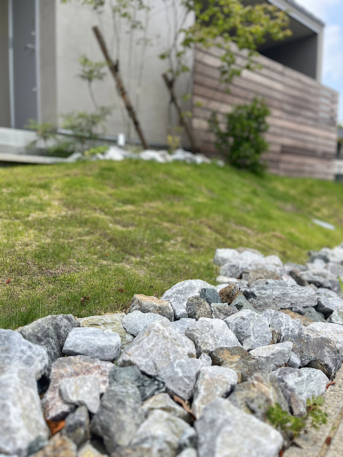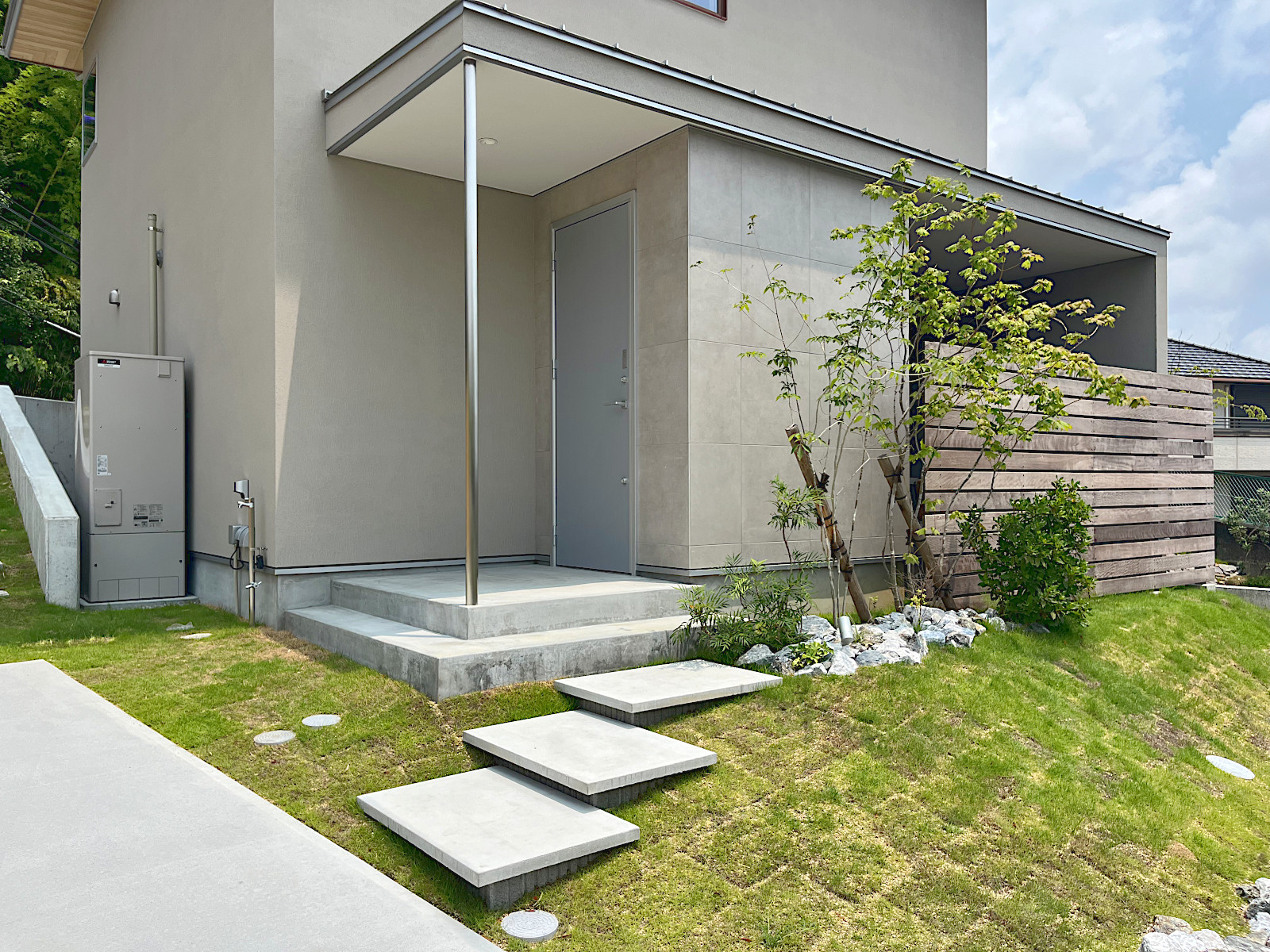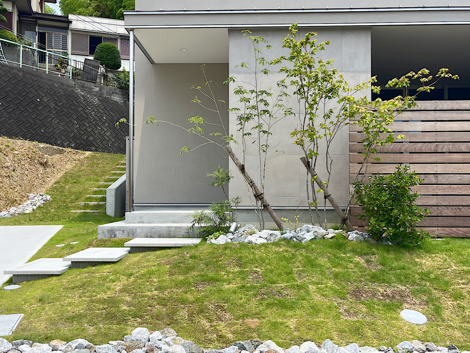 洗練された建物にそっと寄り添う、緑豊かな外構が完成しました。