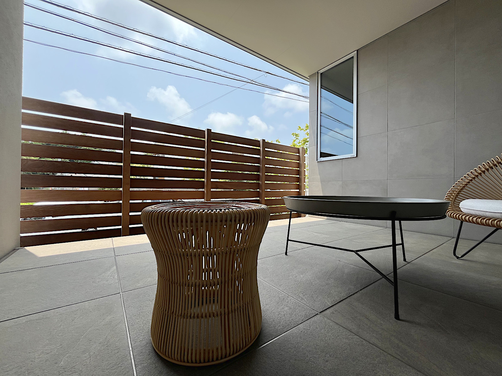 木調目隠しフェンスにタイルが映えるくつろぎの空間