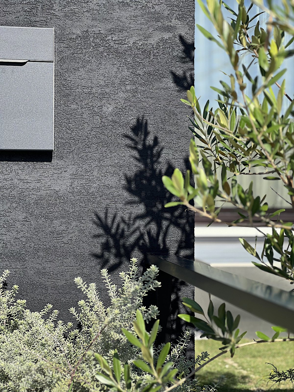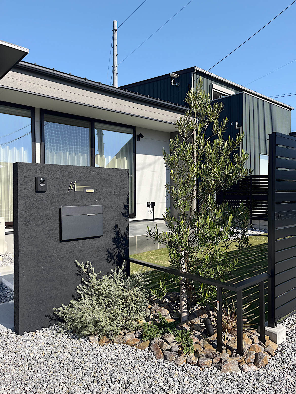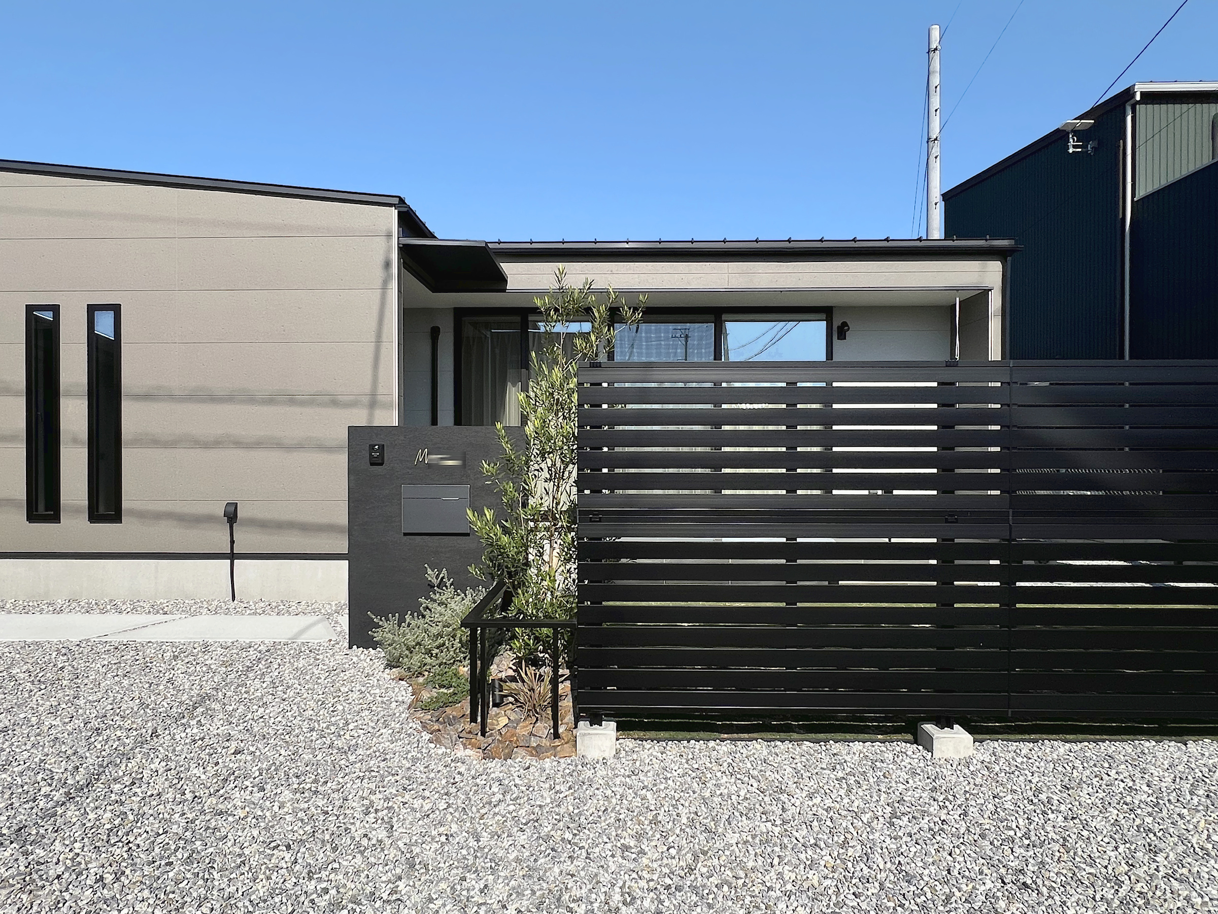 コンクリート風の外壁に締め色ブラックが映えるM様邸。
