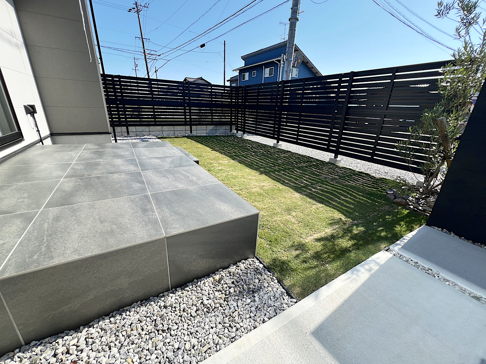 木調目隠しフェンスにタイルが映えるくつろぎの空間